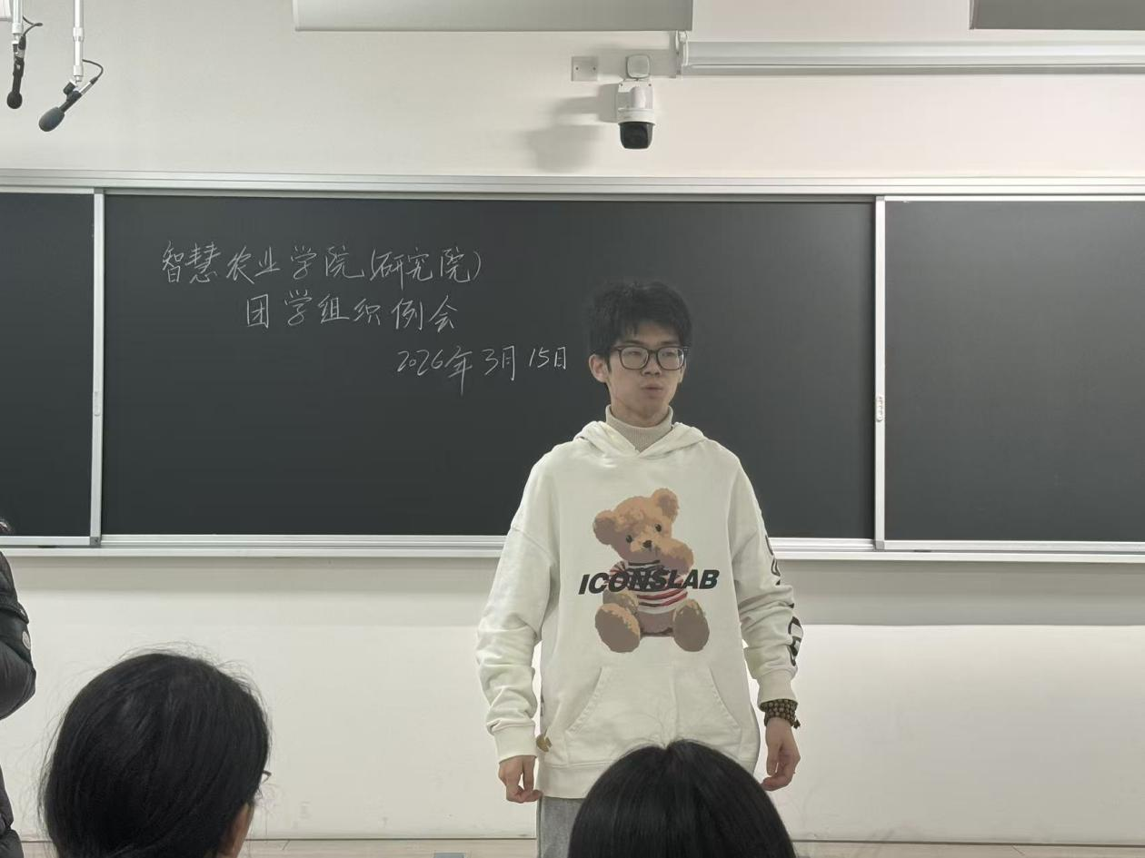 为全面梳理近期工作成效,总结经验不足,明确后续工作方向,推动团学工作高效有序开展,智慧农业学院(研究院)于3月15日在一号教学楼336教室召开团学组织例会。智慧农业学院(研究院)团学组织全体学生干部参加会议。