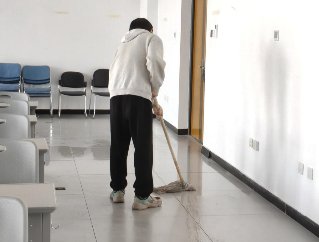 饮水思源,方知感恩之重;躬身实践,方悟责任之深。活动中,学院将受助学生划分为三个小组,分别负责408、416、418三间会议室的卫生清洁维护工作。实践过程中,同学们以饱满的热情分工协作、通力配合,认真清扫地面、细致擦拭桌椅,充分展现出受助学子良好的精神风貌、扎实的劳动素养和强烈的集体观念。在亲手打造整洁舒适的公共环境的过程中,同学们不仅体会到劳动的价值与奉献的意义,更深刻理解了资助政策的温暖与期许,进一步树立起“感恩母校、回馈集体、勇担责任”的思想自觉和行动自觉,让感恩之心在劳动实践中得到淬炼,让励志之志在躬身力行中愈发坚定。