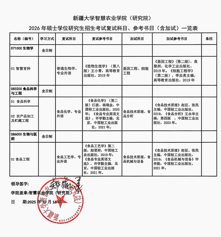 新疆大学智慧农业学院(研究院) 2026年硕士学位研究生招生考试复试科目、参考书目(含加试)一览表
