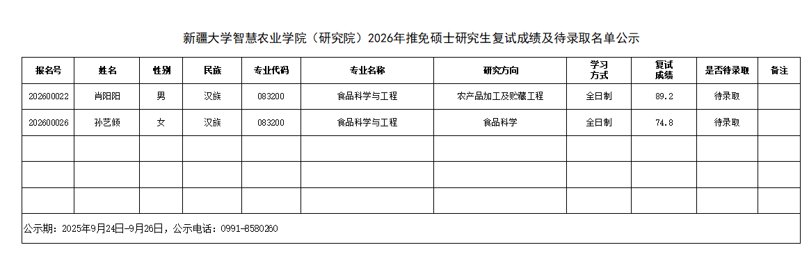 新疆大学智慧农业学院(研究院)2026年推免硕士研究生复试成绩及待录取名单公示