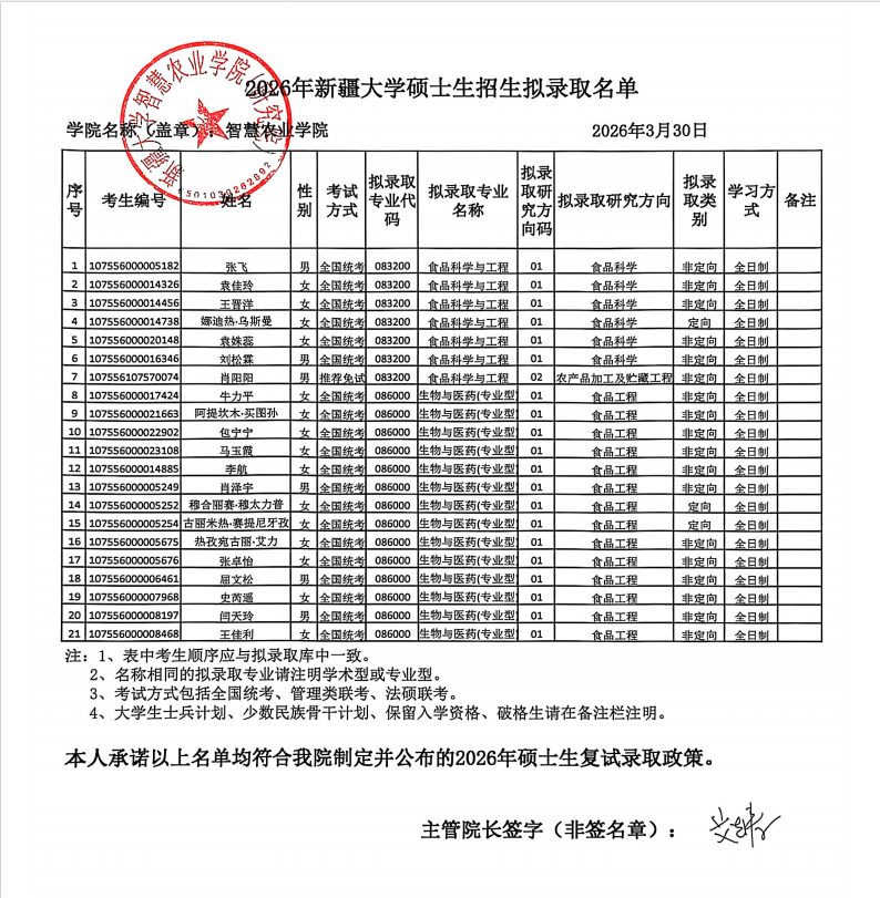 新疆大学智慧农业学院(研究院) 2026年硕士研究生招生考试复试拟录取名单